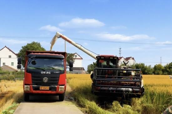 走进张堰镇建农村的田间地头,两台联合收割机正在作业,将稻谷装入运输车,呈现一派繁忙的丰收景象。